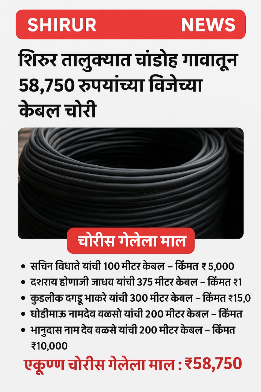 शिरूर तालुक्यात चांडोह गावातून 58,750 रुपयांच्या विजेच्या केबल चोरी विजेची केबल चोरी घटना! शिरूर,दिनांक १ सप्टेंबर २०२५ |प्रतिनिधी| शिरूर तालुक्यात पुन्हा एकदा चोरीची घटना घडली आहे. मौजे चांडोह गावच्या हद्दीत…